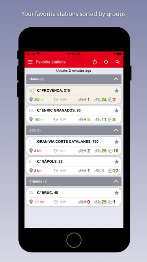 - List of favorite stations categorized by groups (home, work, friends or general).
