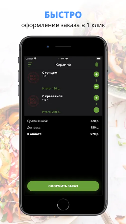 Заказывайте Ваши любимые блюда у нас, и Вы останетесь довольны качеством сервиса. У нас работают опытные повара, а курьеры приятно порадуют вежливостью и быстрой доставкой.