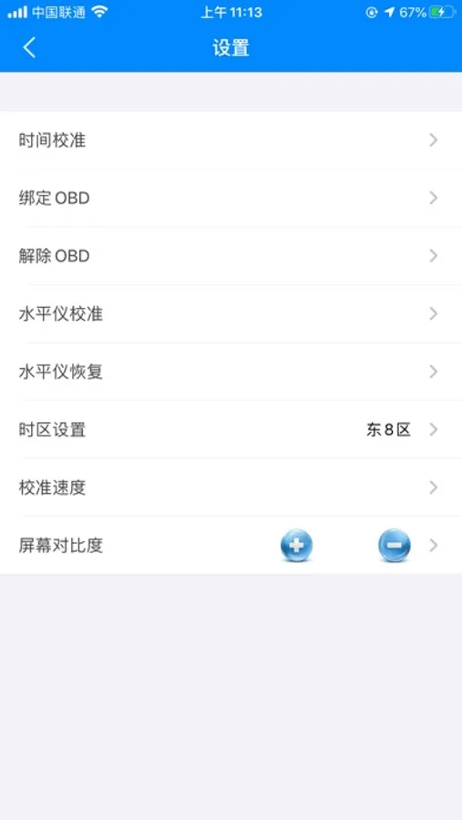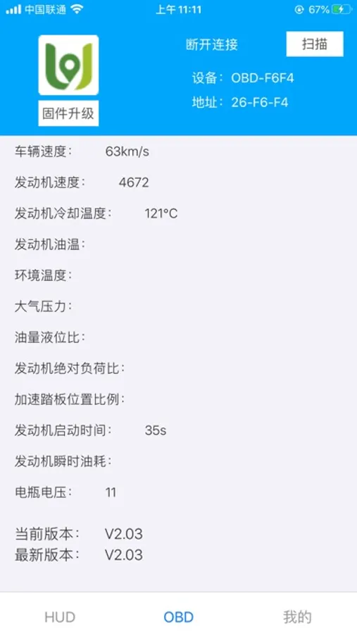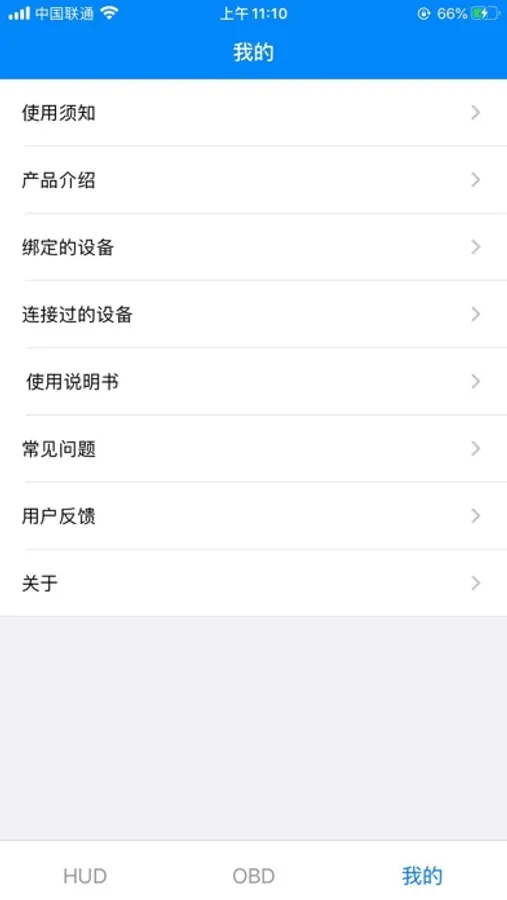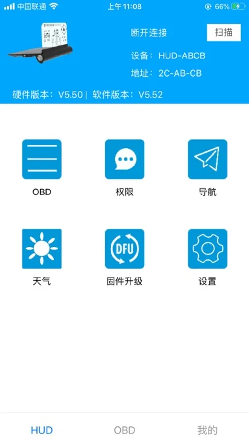 APP采用低功耗蓝牙4.0协议,实现Iphone智能手机和HUD蓝牙设备进行互联通信。通过APP操作界面,可以对HUD设备进行速度校准,时间校准,背光的开关等功能,同时可以把导航信息传输到HUD设备上。同时可以通过APP对蓝牙OBD设备进行扫描,在Iphone上显示车辆的相关检测信息。