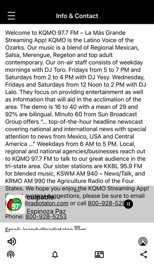 Welcome to KQMO 97.7 FM – La Más Grande Streaming App! KQMO is the Latino Voice of the Ozarks. Our music is a blend of Regional Mexican, Salsa, Merengue, Regeton and top adult contemporary. Our on-air staff consists of weekday mornings with DJ Toro. Fridays from 5 to 7 PM and Saturdays from 2 to 4 PM with DJ Yesy. Wednesday, Fridays and Saturdays from 12 Noon to 2 PM with DJ Lalo. They focus on providing entertainment as well as information that will aid in the acclimation of the area. The demo is 16 to 40 with a mean of 29 and 92% are bilingual.