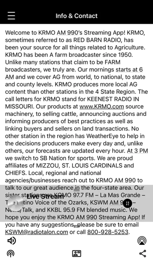 Welcome to KRMO AM 990’s Streaming App! KRMO, sometimes referred to as RED BARN RADIO, has been your source for all things related to Agriculture. KRMO has been A farm broadcaster since 1950. Unlike many stations that claim to be FARM broadcasters, we truly are. Our mornings starts at 6 AM and we cover AG from world, to national, to state and county levels. KRMO produces more local AG content than other stations in the 4 State Region. The call letters for KRMO stand for KEENEST RADIO IN MISSOURI. Our products at www.KRMO.com source machinery, to selling cattle, announcing auctions and informing producers of best practices as well as linking buyers and sellers on land transactions. No other station in the region has WeatherEye to help in the decisions producers make every day and, unlike others, our forecasts are updated every hour. At 3 PM we switch to SB Nation for sports. We are proud affiliates of MIZZOU, ST. LOUIS CARDINALS and CHIEFS.