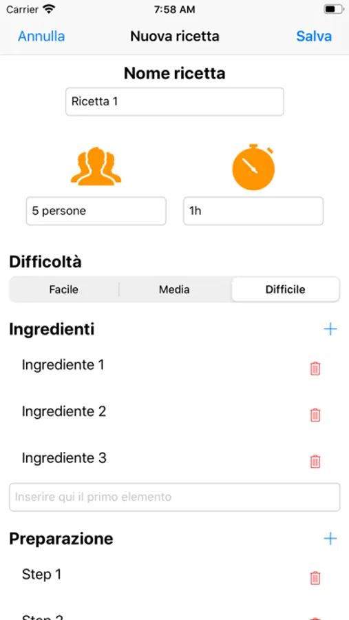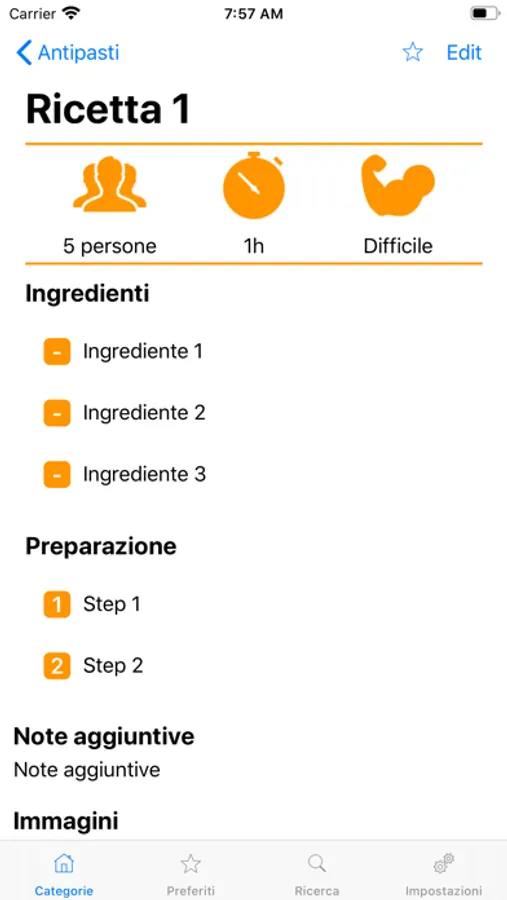 Con myRicettario puoi salvare le tue ricette suddivise per categoria, segnare titolo, quantità, difficoltà, ingredienti e passaggi suddividendoli per punti. Ad ogni ricetta puoi associare da subito o in un secondo momento il numero di immagini che preferisci da sfogliare poi in una comoda galleria.