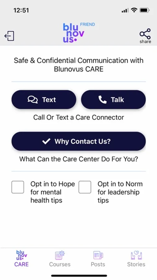 Provides individuals with access to BluNovus Care services including text and call-in access to the Care Center and simplifies log in access to the standalone BluNovus learning management system