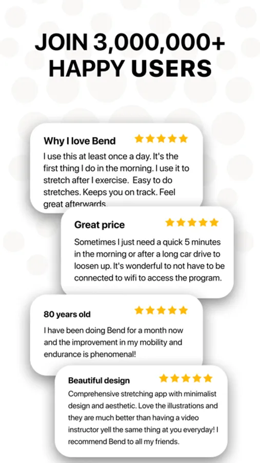 Bend® is the simple, affordable way to make stretching a part of your daily routine. Our quick & convenient stretching routines help you improve your flexibility and maintain your natural range of motion as you get older. We offer hundreds of stretches and yoga poses along with dozens of easy-to-follow stretching routines designed for all ages and experience levels. It's never too early to start stretching everyday!