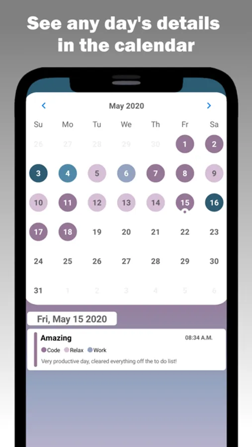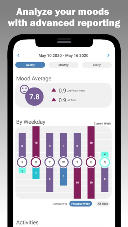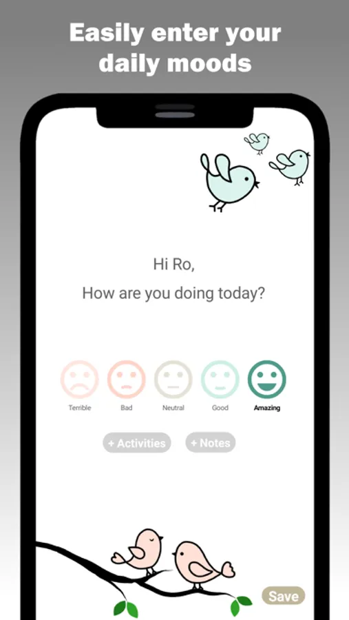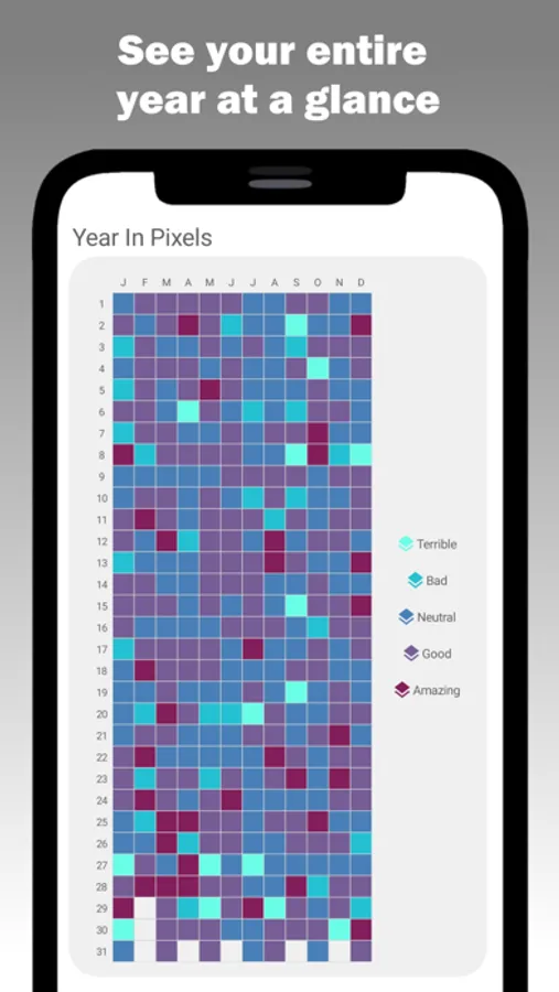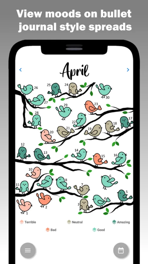 Every day, we'll ask you how you're doing and you'll tell us. It's as simple as that! We'll then show your moods to you with a bullet-journal style theme. We create new themes every month to keep things fresh and exciting!