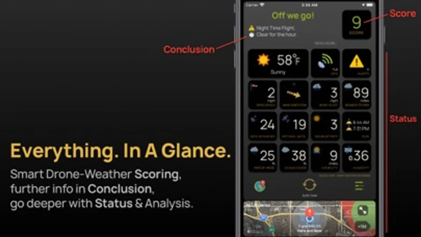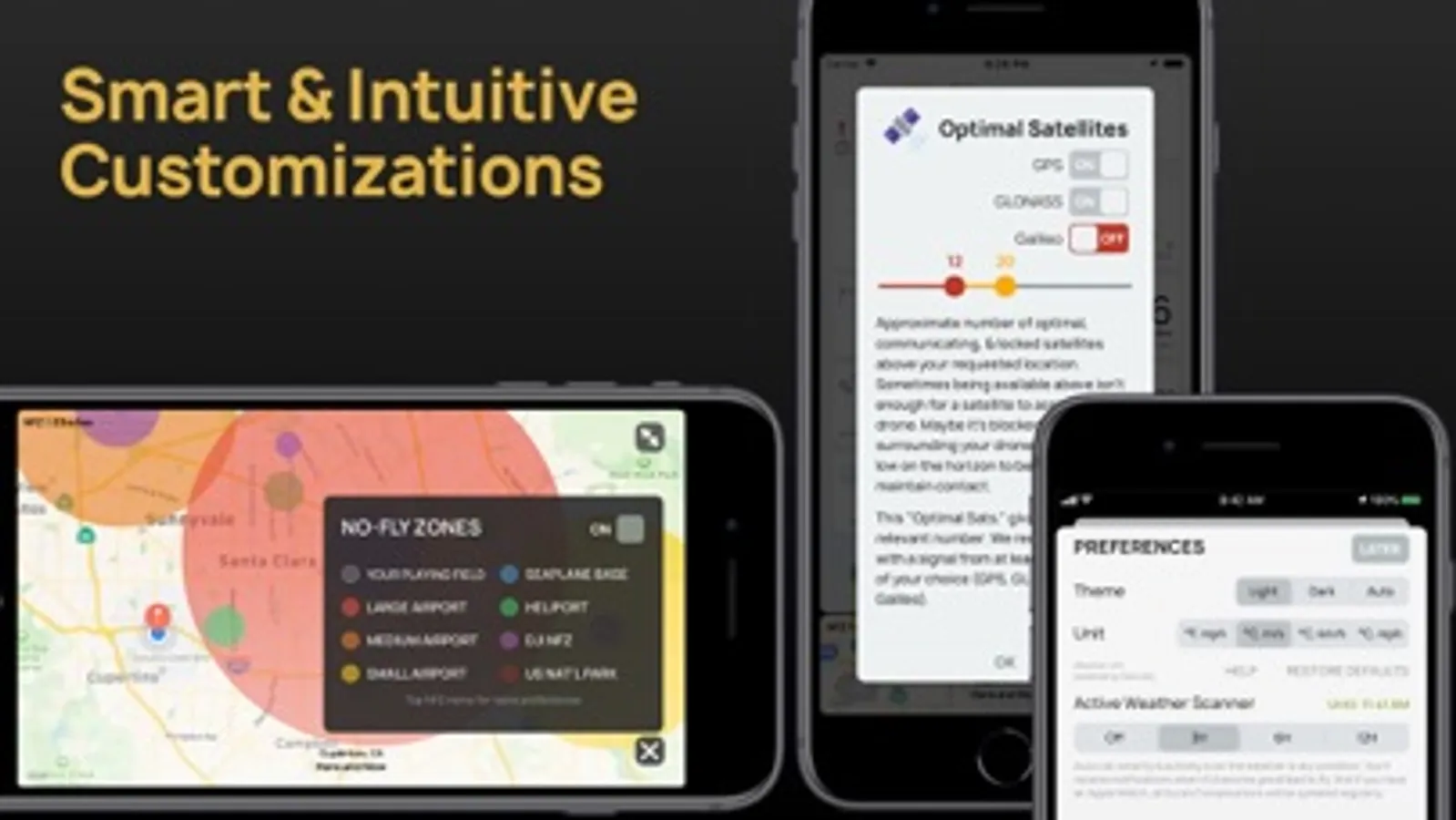 • Wind, satellites (GPS, GLONASS, Galileo, Beiduo), No-Fly Zones, government weather alerts, solar activity (Kp), pressure, precipitation, visibility, etc.