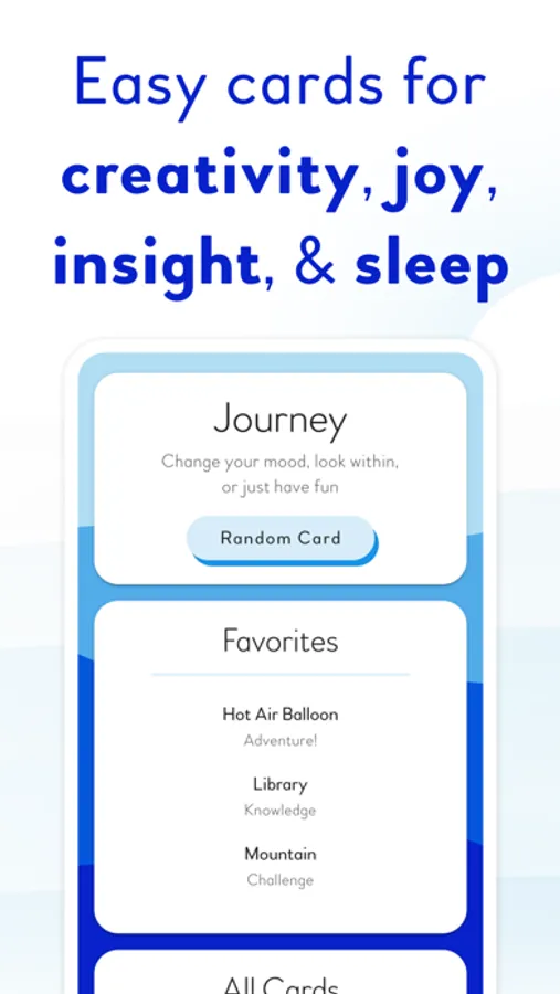 • 100+ easy imagination cards for different moods and situations, like practicing gratitude, facing a challenge, and finding inspiration.