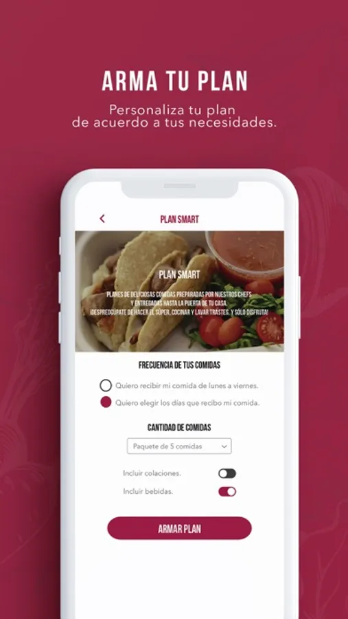 • Arma tu plan y selecciona cuántas comidas quieres recibir. ¡Cada plan puede acomodarse a tus necesidades!