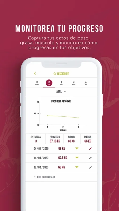 • Monitorea tu progreso y captura nuevas entradas de peso, grasa, músculo y agua.