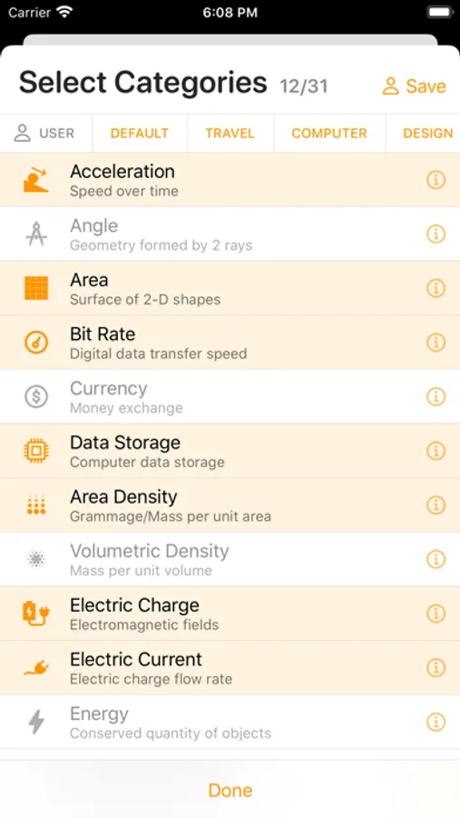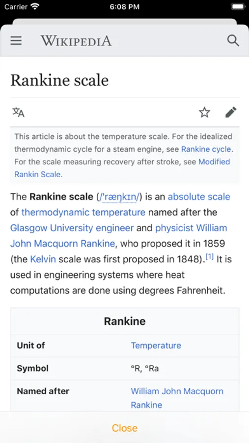 Wikipedia page information can be pulled for categories and conversion units. (Look for info circle.)