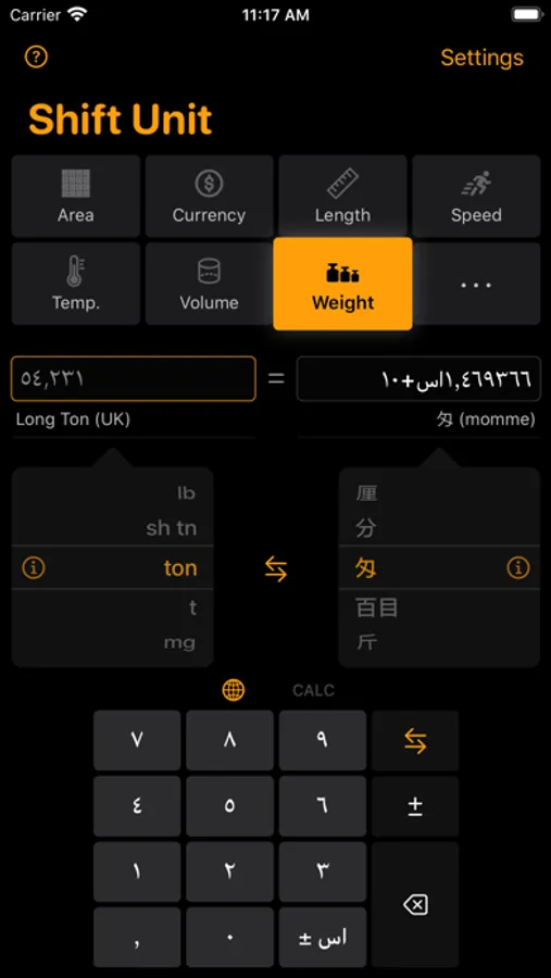 The custom keypad has a calculator mode, and allows to enter/edit numbers on either side of the conversion.