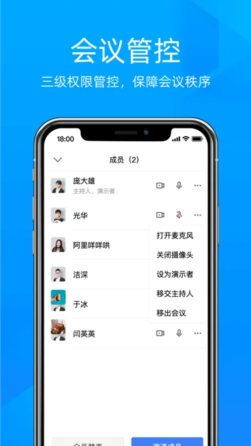 【会议管控】会议内有主持人、演示者和听众的三级权限管控机制。主持人可以指定演示者、管理参会人,保证会议有序进行。