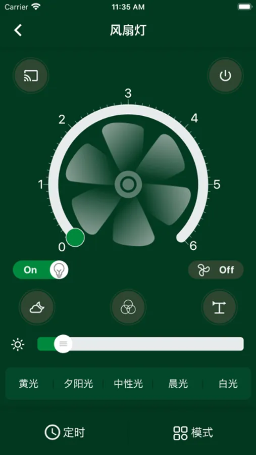 1)基本控制:风扇开关与档位调节。调节灯亮度、色温,切换情景模式等