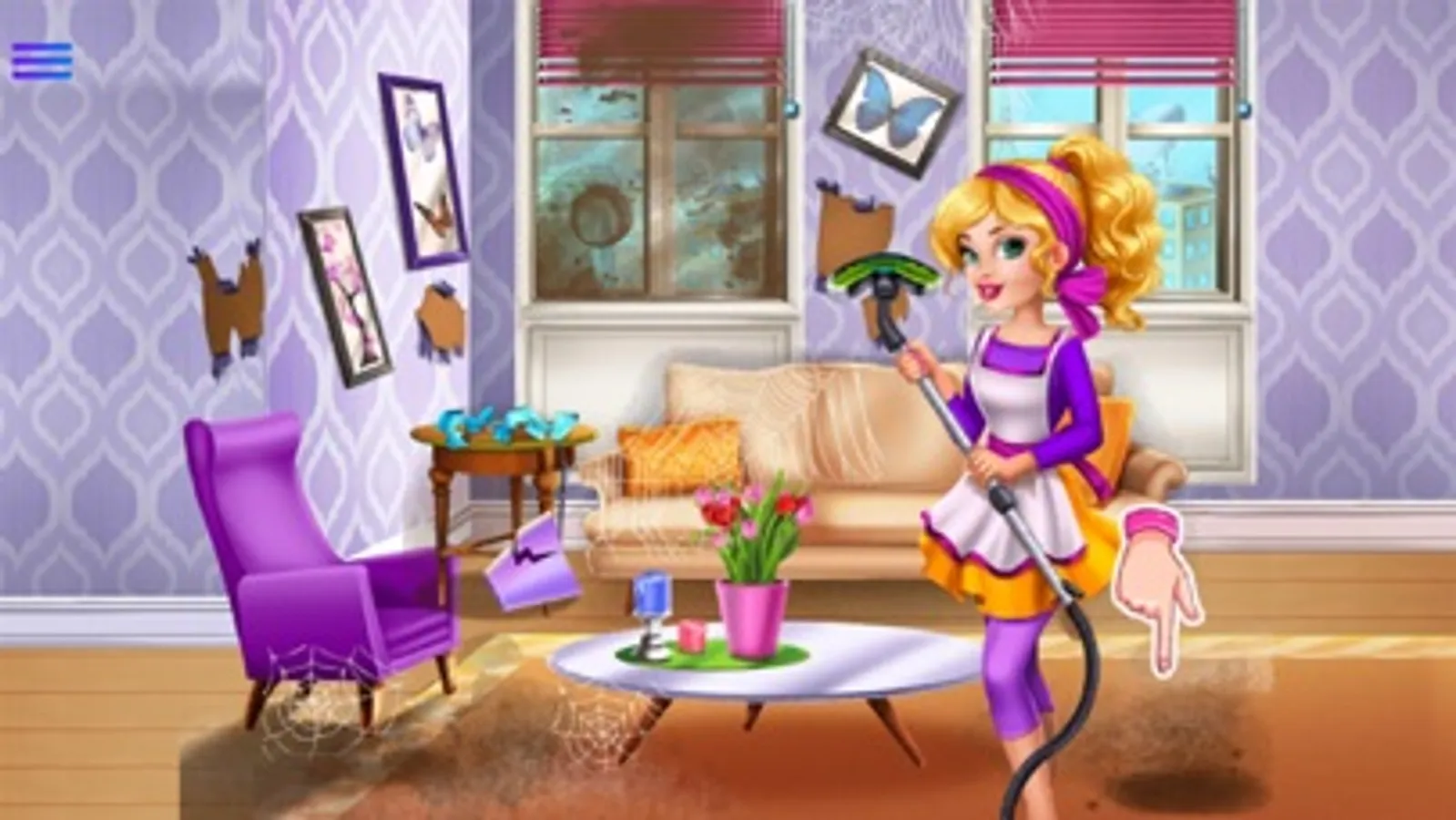 In it you perform a complete cleaning process with disinfection with special sterilizers for the salon room and it is the reception room for guests or visitors where in this room you move things from the wrong places to the right places then clean the floor and throw garbage in the trash and put the cleaning fluid in the dirty places with cleaning well then You put the water and wipe the floors with the mop that makes the floor shine, then put the air freshener around the place until the place becomes clean and beautiful and you will be Mama Sarah and Barbie very happy try it now.
