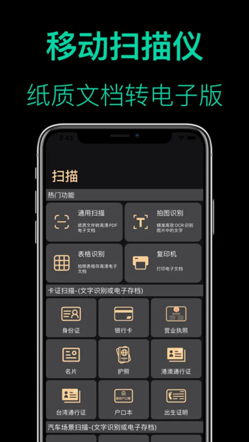 • 极致的扫描结果:极致高清扫描任何纸质文件,包括:文件、合同、照片、卡片、票据 等。