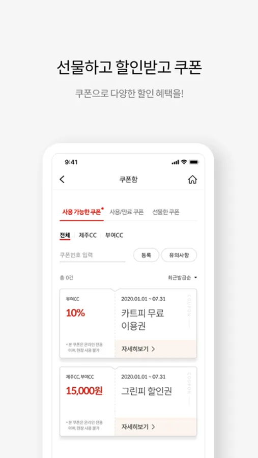 - 온라인쿠폰 : 그린피, 카트피 할인쿠폰 구매 및 선물 기능 제공