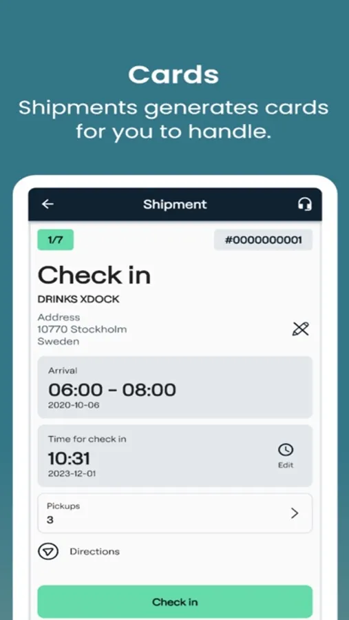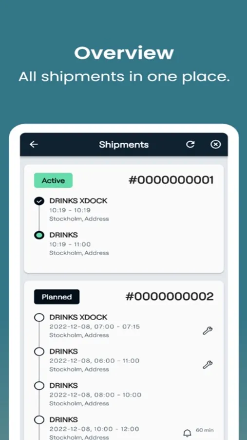 The app assists you through every stop on your shipments, ensuring a smooth delivery! Register check-ins, make sure all services are completed and parcels are delivered, register eventual deviations and check out. Close the shipment in order to mark it as completed.