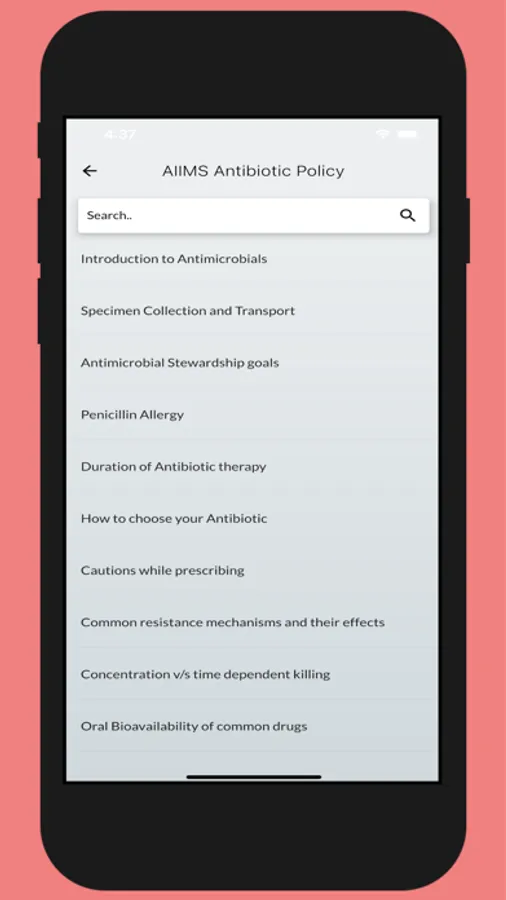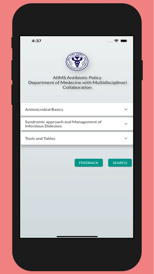 This application has been developed by the Department of Medicine, AIIMS New Delhi, with inputs from various surgical and medical disciplines at the institute. The antibiotic policy has been developed based on the hospital antibiogram and available recent literature. Also, this policy has been developed keeping the adult population in mind and should not be extrapolated to the paediatric age group. User discretion is advised when following this policy document, as antibiotic choice should be guided by the local antibiogram.