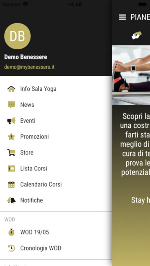 “My Benessere” consente inoltre di inviare notifiche push per comunicare rapidamente con tutti gli associati, proponendo eventi, promozioni, news o comunicazioni di vario genere. E' inoltre possibile visualizzare il calendario completo dei corsi disponibili, il wod giornaliero, gli istruttori che compongono lo staff.