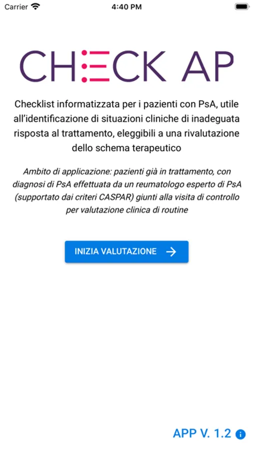 Ambito di applicazione: pazienti già in trattamento, con diagnosi di PsA effettuata da un reumatologo esperto di PsA (supportato dai criteri CASPAR) giunti alla visita di controllo per valutazione clinica di routine.