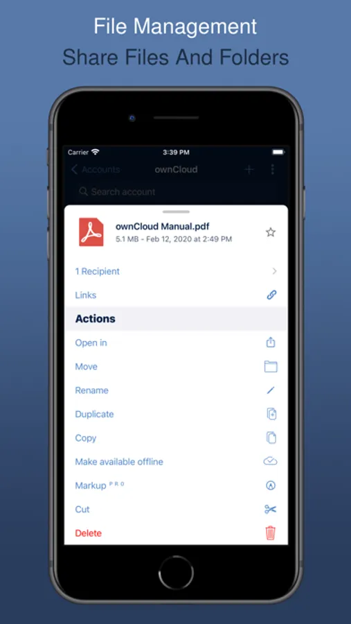 With the ownCloud iOS EMM-App you can browse all of your ownCloud synced files, create and edit new files, share these files and folders with co-workers, and keep the contents of those folders in sync across all of your devices. Simply copy a file into a directory on your server and ownCloud does the rest.