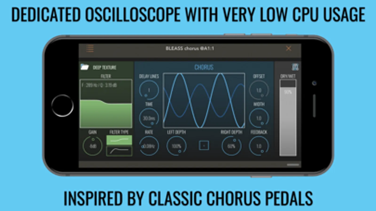 BLEASS Chorus is a two-stage chorus effect that offers a full control of the stereo image as well as a large range of effects, from subtle stereo wideners to crazy texture generators which you can visualize thanks to a dedicated oscilloscope with a very low CPU usage.