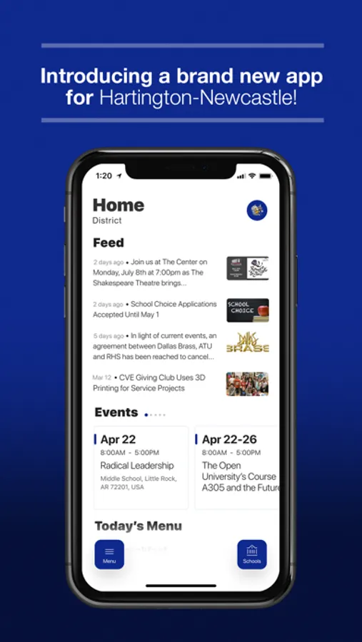 The event section shows a list of events throughout the district. Users can add an event to their calendar to share the event with friends and family with one tap.