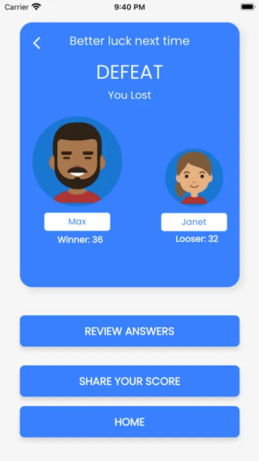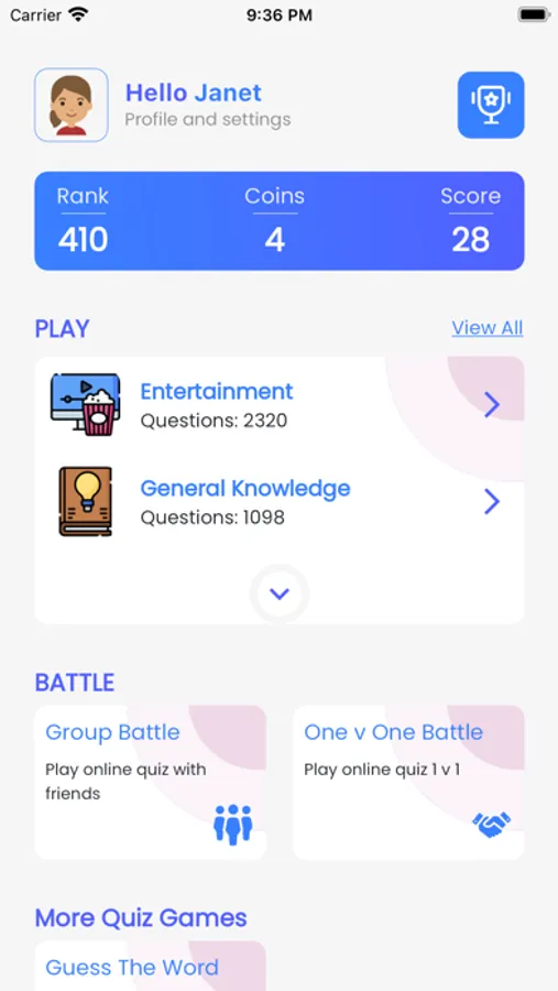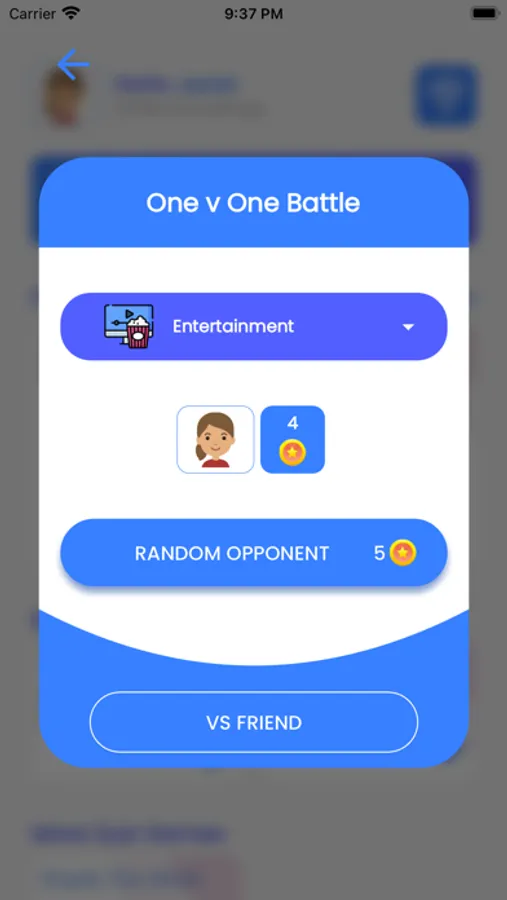 - Battle friends in quiz categories or play a random battle.