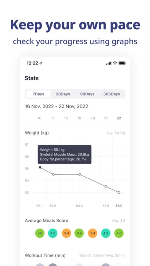 - Your meals, body condition, exercise logs... all at one place! You can also check your progress using graphs.