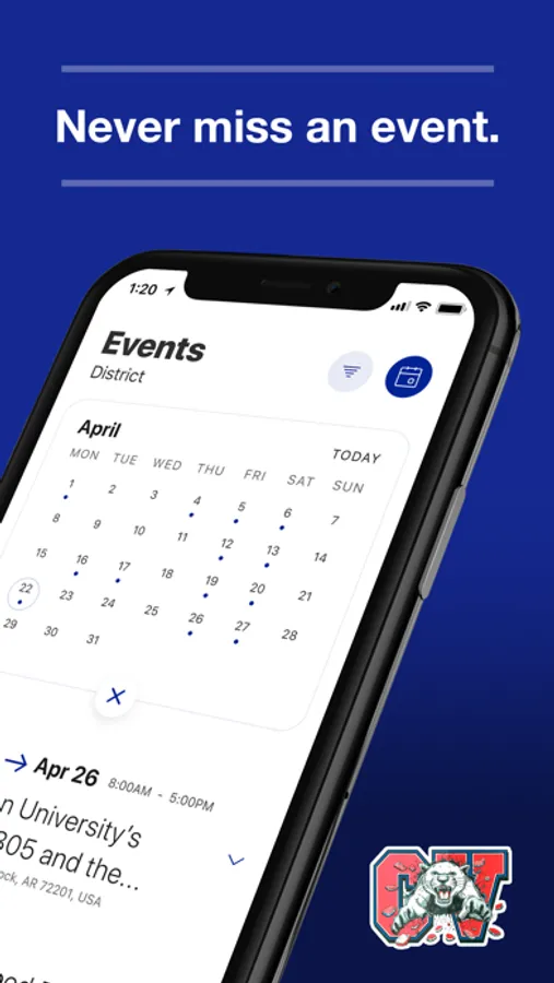 The event section shows a list of events throughout the district. Users can add an event to your calendar to share the event with friends and family with one tap.