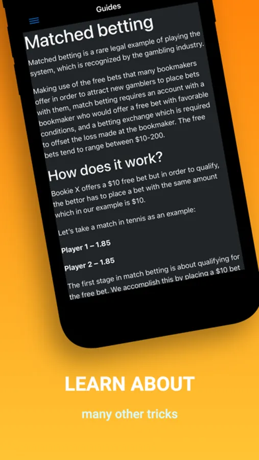 In addition to tips, this application also contains some guides for beginners in e-sports: money management, arbitrage betting, bonus management.