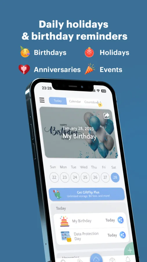 Start celebrating holidays, birthdays and special occasions in style with giftflip! With birthday reminders and daily holidays, giftflip is the ultimate way to stay in the know about holidays, birthdays, anniversaries and special occasions. Our birthday reminder and holiday calendar keeps you up-to-date with reminders of every day with the ability to add birthdays, anniversaries, or any other special event! We celebrate every day with an exciting holiday and every day includes a history lesson on how the holiday came about! From Christmas to St. Patrick's Day to World Whale Day and National Dog Day, you'll never forget a holiday or special occasion again! With our personalized holiday calendar, birthday countdown, and anniversary reminders, learn the history of holidays while keeping track of your life’s special events with ease!