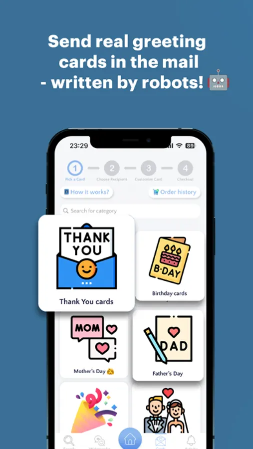 • Send real greeting cards in the mail – we use robots with human-like handwriting to write our cards! Choose your card, type your message, and add the recipient in just a few taps – greetings cards are sent via the United States Postal Service and arrive in 4-5 business days.