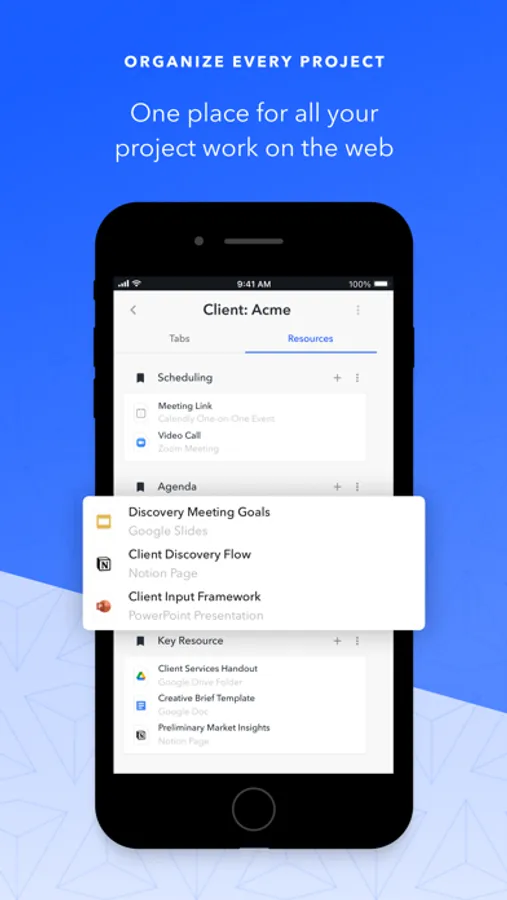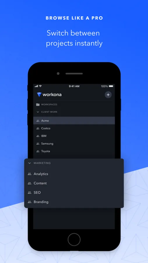 Workona lets you organize everything for a project within workspaces. Use the Workona iPad & iPhone apps to: