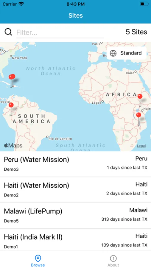 Want to see how many gallons of water a site produced today? No problem! How about the time-in-use for one of your hand pumps? A snap! With a clean interface, map view, site list, and detailed graph views, you can keep tabs on the clean water installations you have operating in the field.