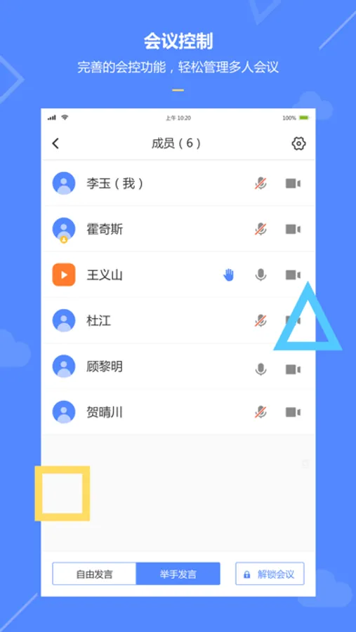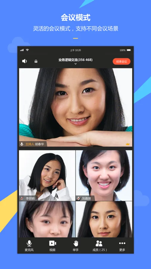 组织正式会议:可支持1000+人数的大型会议,同时可以通过会议模式的设置,如主讲模式,还原线下真实会议的场景,保持会议严肃氛围。丰富的会控功能,主持人快速轻松的管控会议进程,可以通过自由发言、举手发言,控制会议发言节奏,通过会议计时,有效把控会议时长,会议锁定有效控制参会人员。