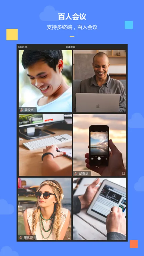 头脑风暴会:可以同时支持16路音视频,轻松支持团队内部的头脑风暴会,稳定的流畅高清视频画面、高质音频原声输出,独有的网络波动兼容技术,全面保障会议体验。