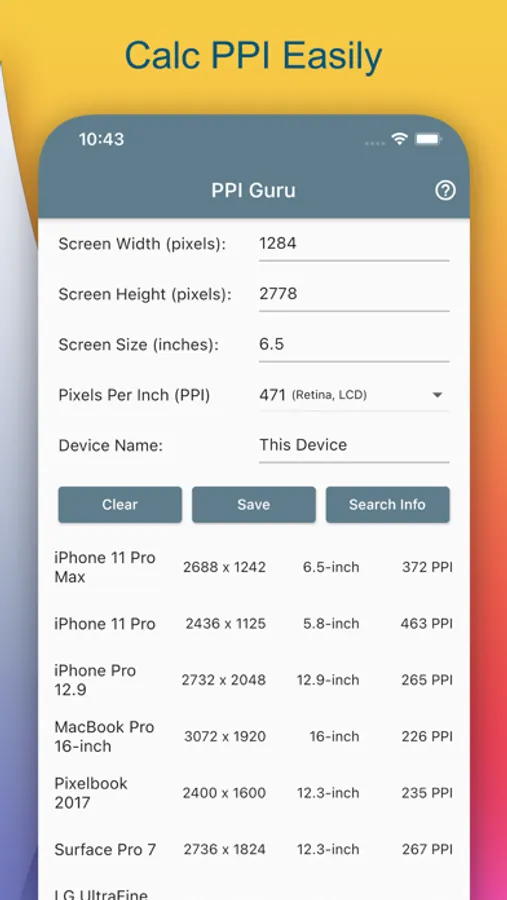 For public sale devices, you can just enter device name, then press Search Info, PPI Guru will search that name with Google, then grab display's information of that device.