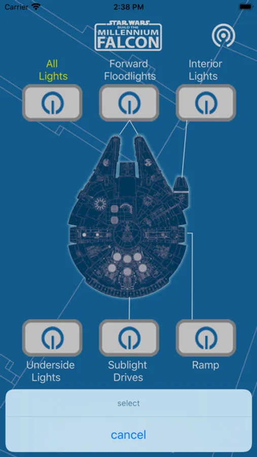 This function is the master lighting control, allowing you to turn on all of the starship’s lights with one touch of a button. Another touch will turn all the lights off at the same time.