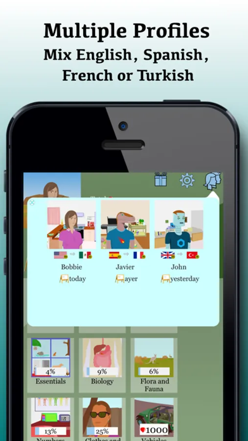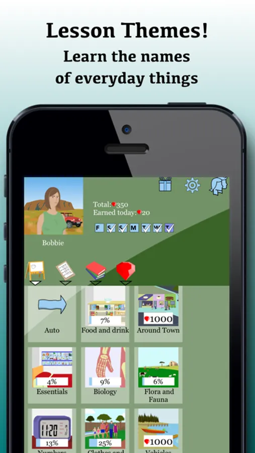 The more lessons and tests you take, the more Gems you earn. Use your Gems to unlock even more words, get cool avatars or use awesome themes.