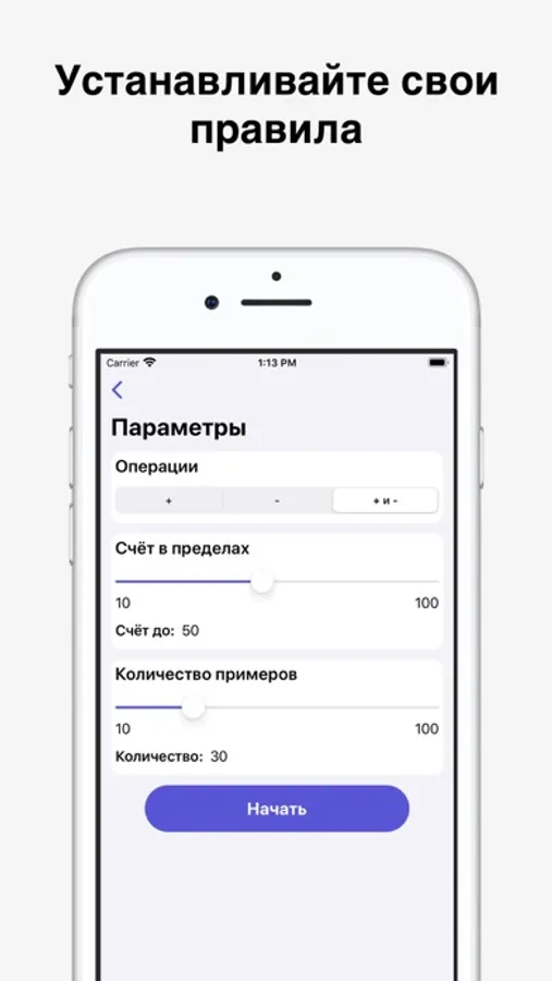 - Конфигурируйте столбики, как Вам нужно. Регулируйте количество примеров, операции, а также пределы счета