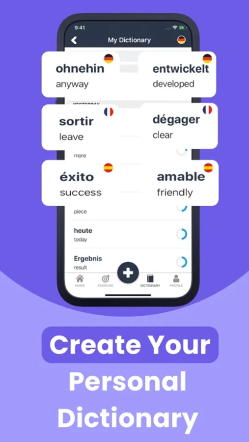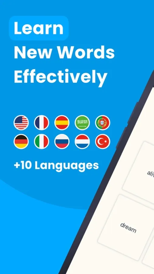 Learn English, Spanish, German, French, Turkish, Russian, Dutch, Arabic, Italian, and Portuguese words. Learn as much or as little as you want. You only need 5 minutes a day to improve. Our short and effective word exercises get you to memorize new foreign words and get you speaking with confidence.