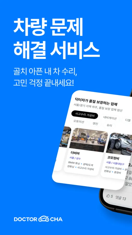 닥터차는 현장 전문가들의 경험과 70만 건의 국내 정비사례 데이터, 전국 4만 차량 업체 정보를 바탕으로 고객님의 자동차 정비/유지 관리 고민을 해결해 드립니다.