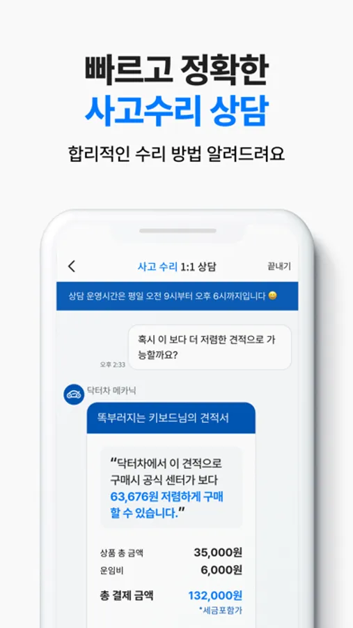 수리 견적 얼마나 나올까요? 부품/사고수리/타이어/외장수리/점검/판금/도색 가격 정보, 닥터차 메카닉에게 편하게 물어보세요.