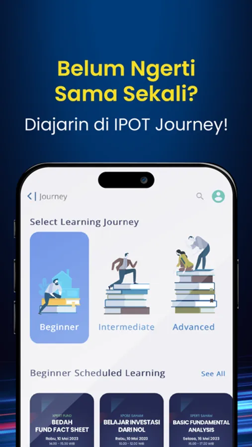 Konten edukasi dalam berbagai macam format dan jadwal kegiatan edukasi tersedia di laman Journey. Kamu bisa memilih konten dan mengikuti kegiatan edukasi yang sesuai dengan kebutuhan untuk meningkatkan pengetahuan investasimu. Kamu akan dibimbing dari newbie sampai jago!