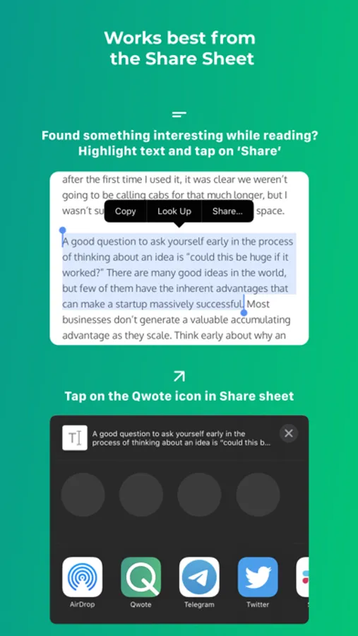 - You will get an editor inside the Qwote app with your selected text pre-filled