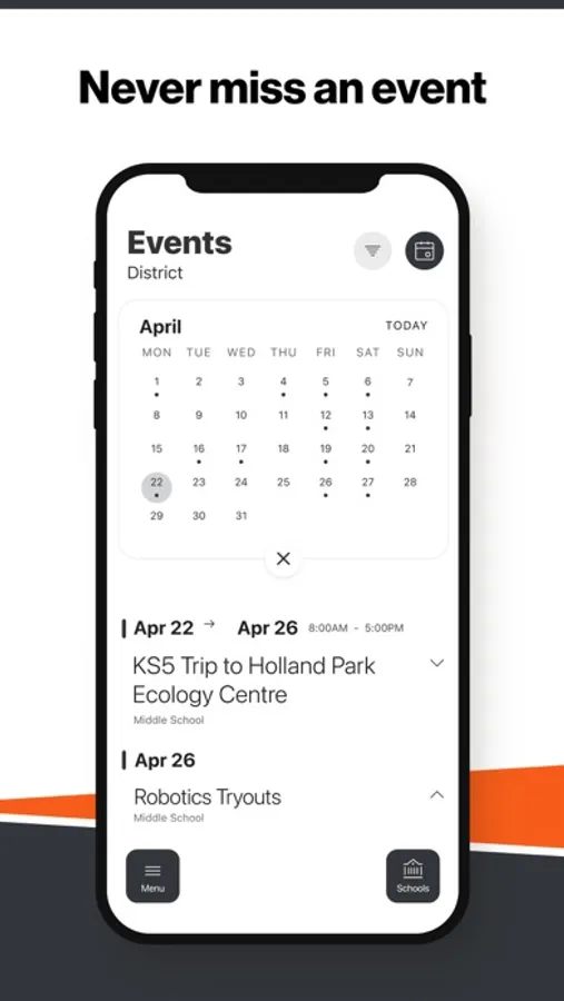 The event section shows a list of events throughout the district. Users can add an event to your calendar to share the event with friends and family with one tap.