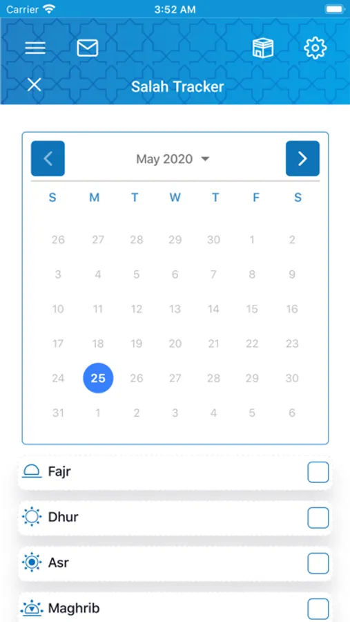 • Keep a record of your daily Salah and track any Qazah prayers. (Please note that your record will start from once the app has been downloaded).