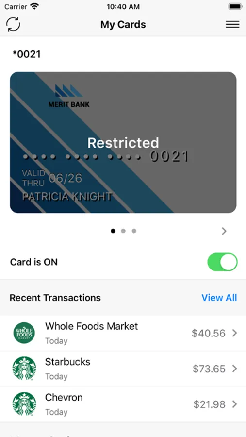 Merit Bank Card protects your debit and credit cards by sending transaction alerts and enabling you to define when, where and how your cards are used. Download to your smartphone, then set your preferences to monitor and manage your cards.