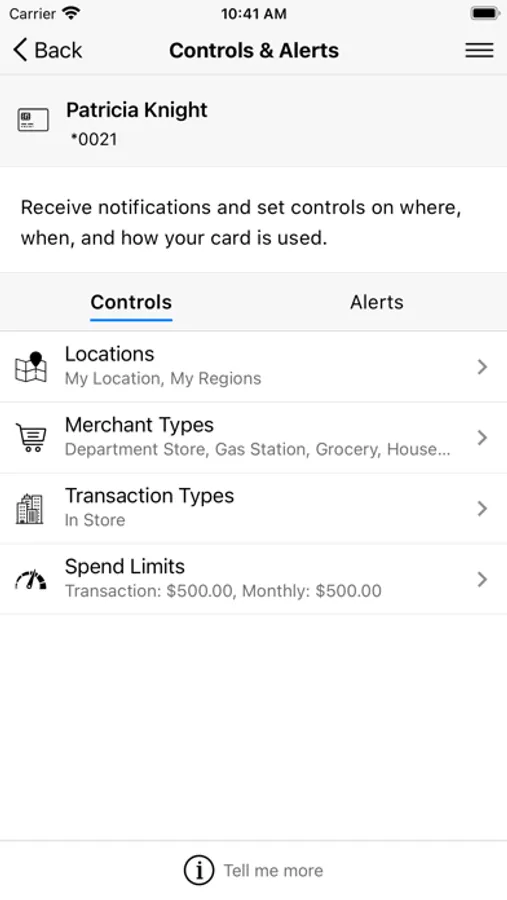 Set spending limits to decline transactions above your thresholds. Monitor activity by category such as gas stations and restaurants, and by type: in-store purchases, e-commerce transactions and ATM transactions.